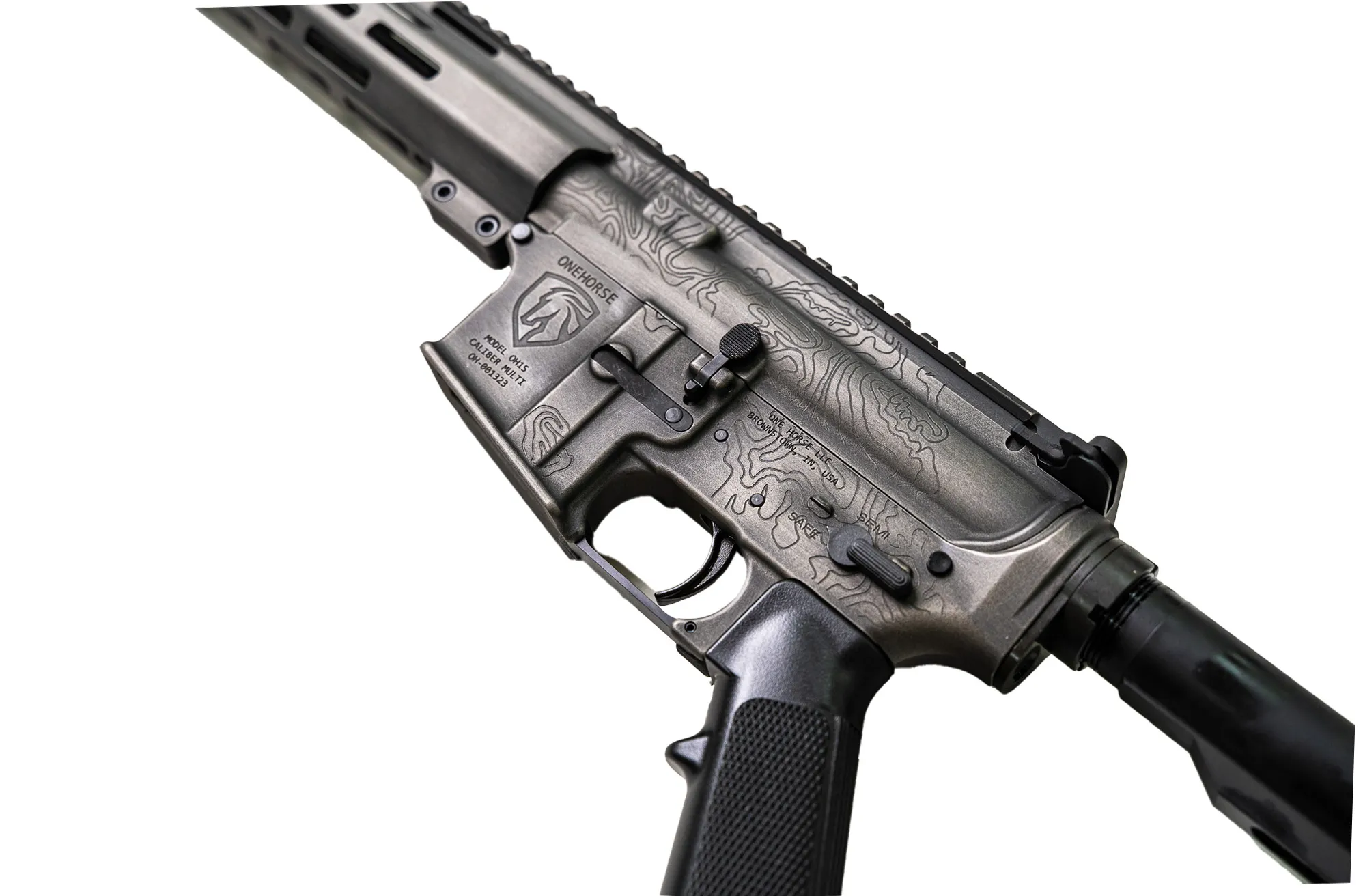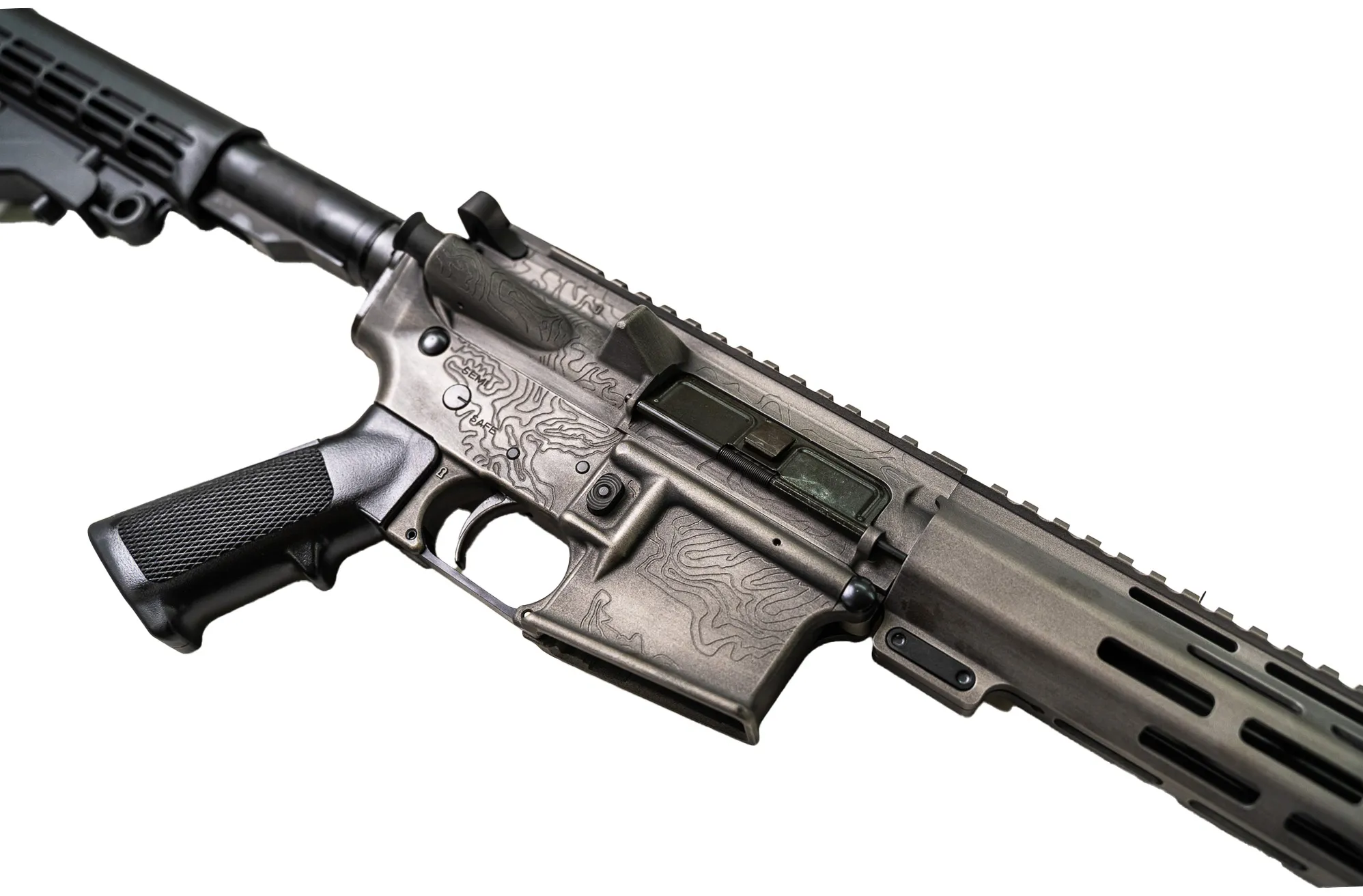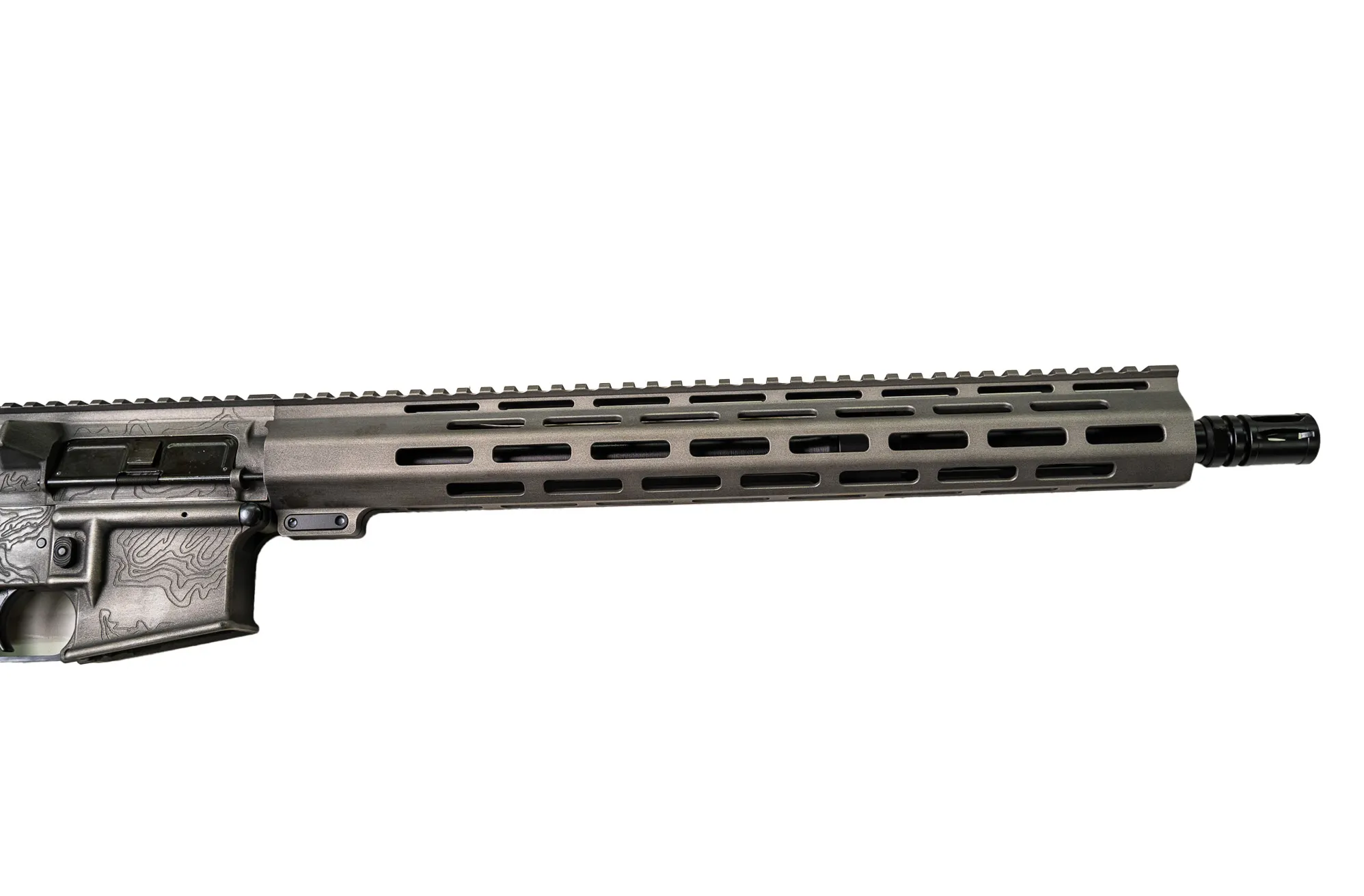 Finished in a clean, understated gray, this rifle features laser-engraved topographical mapping across the upper—precise, permanent, and purpose-driven. The topo lines aren’t decoration. They’re a statement of movement, terrain, and intent, cut into the metal for those who value substance over noise.