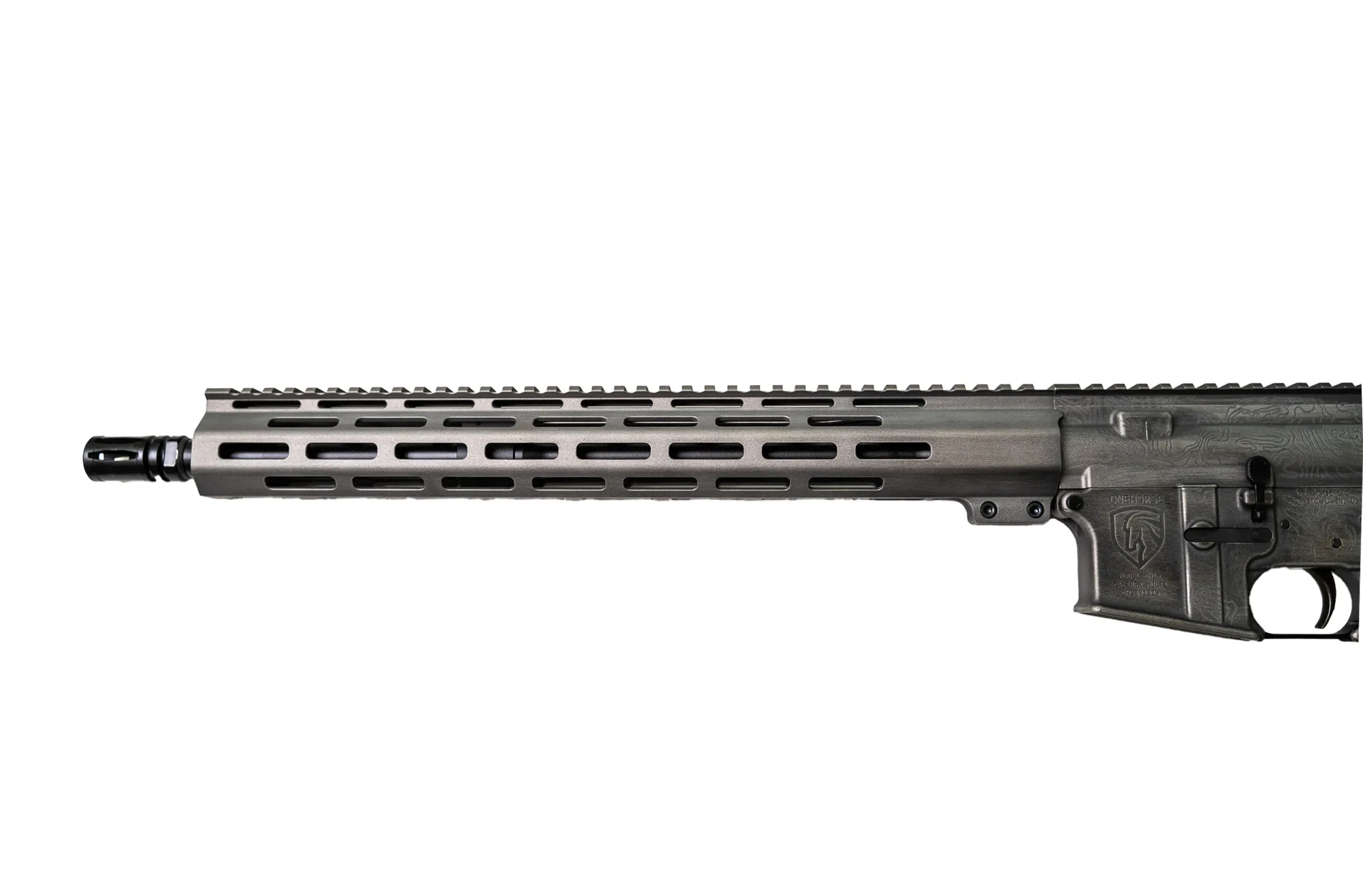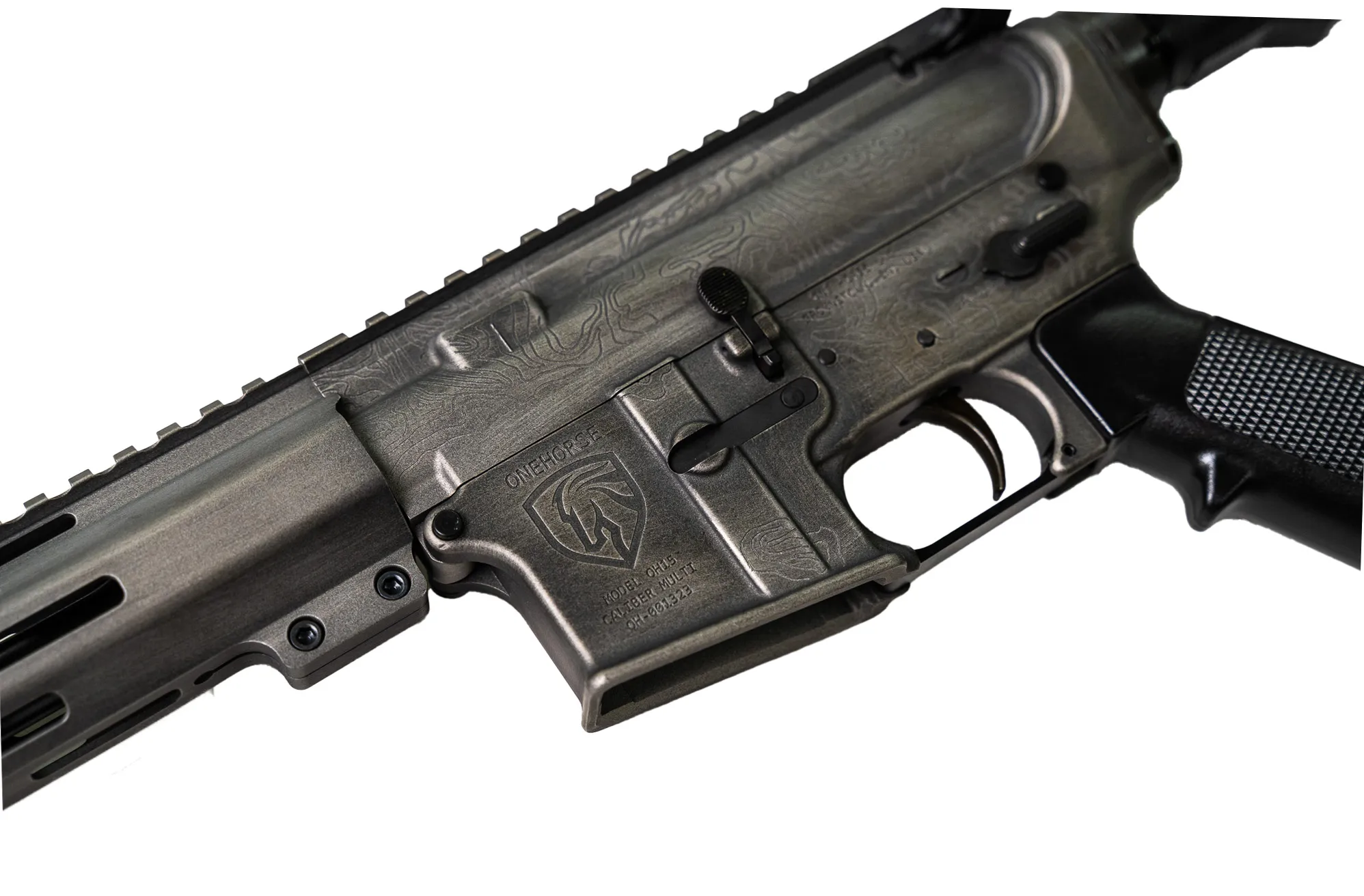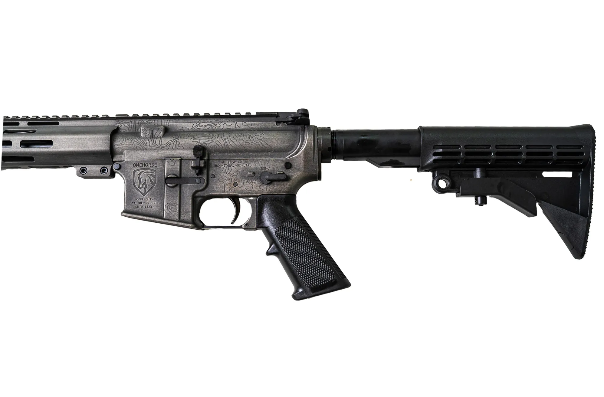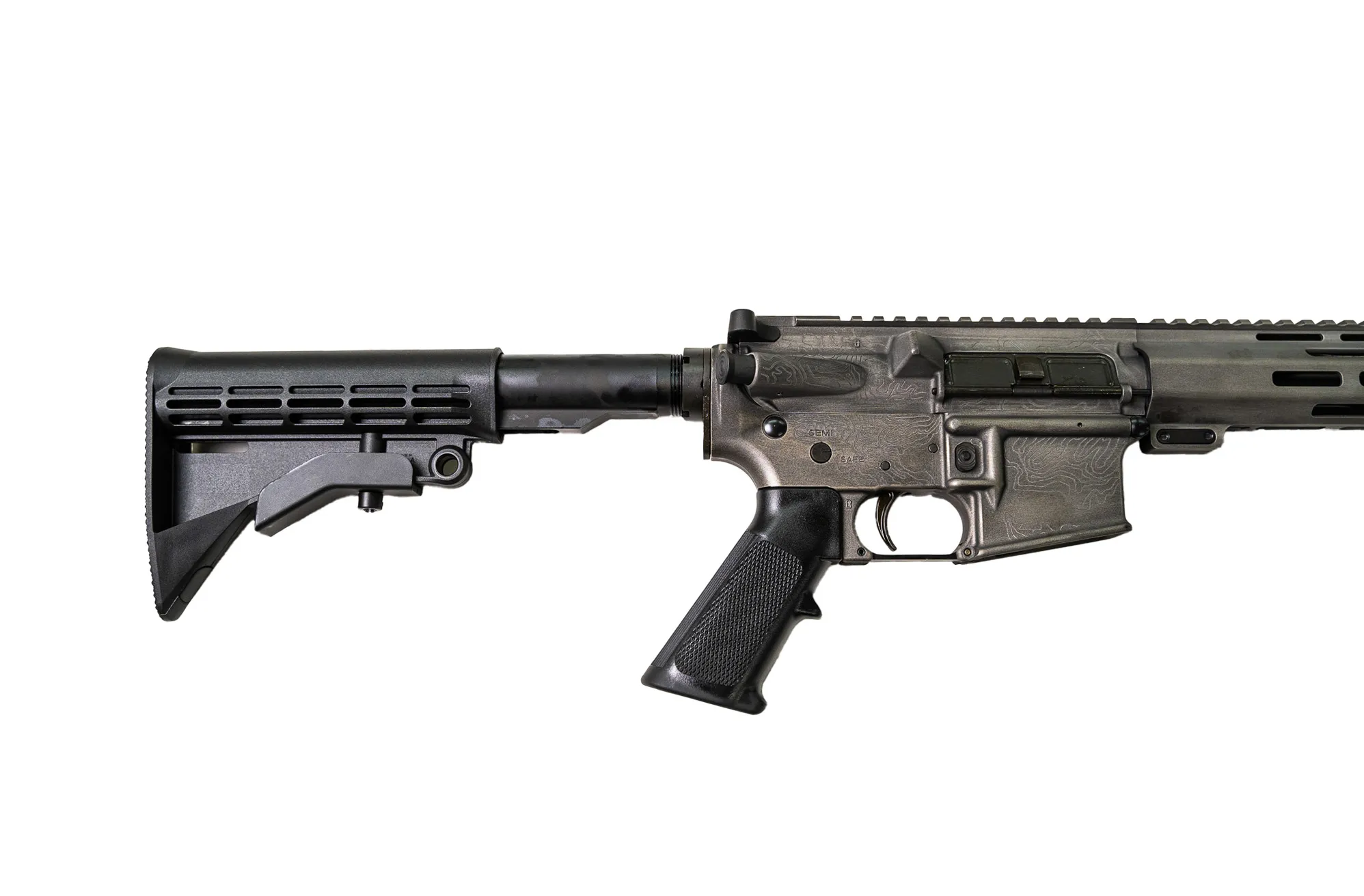 Finished in a clean, understated gray, this rifle features laser-engraved topographical mapping across the upper—precise, permanent, and purpose-driven. The topo lines aren’t decoration. They’re a statement of movement, terrain, and intent, cut into the metal for those who value substance over noise.